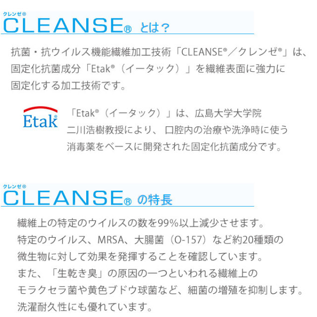 (注意)抗菌、抗ウィルス加工は、病気の治療や予防を目的とするものではありません。